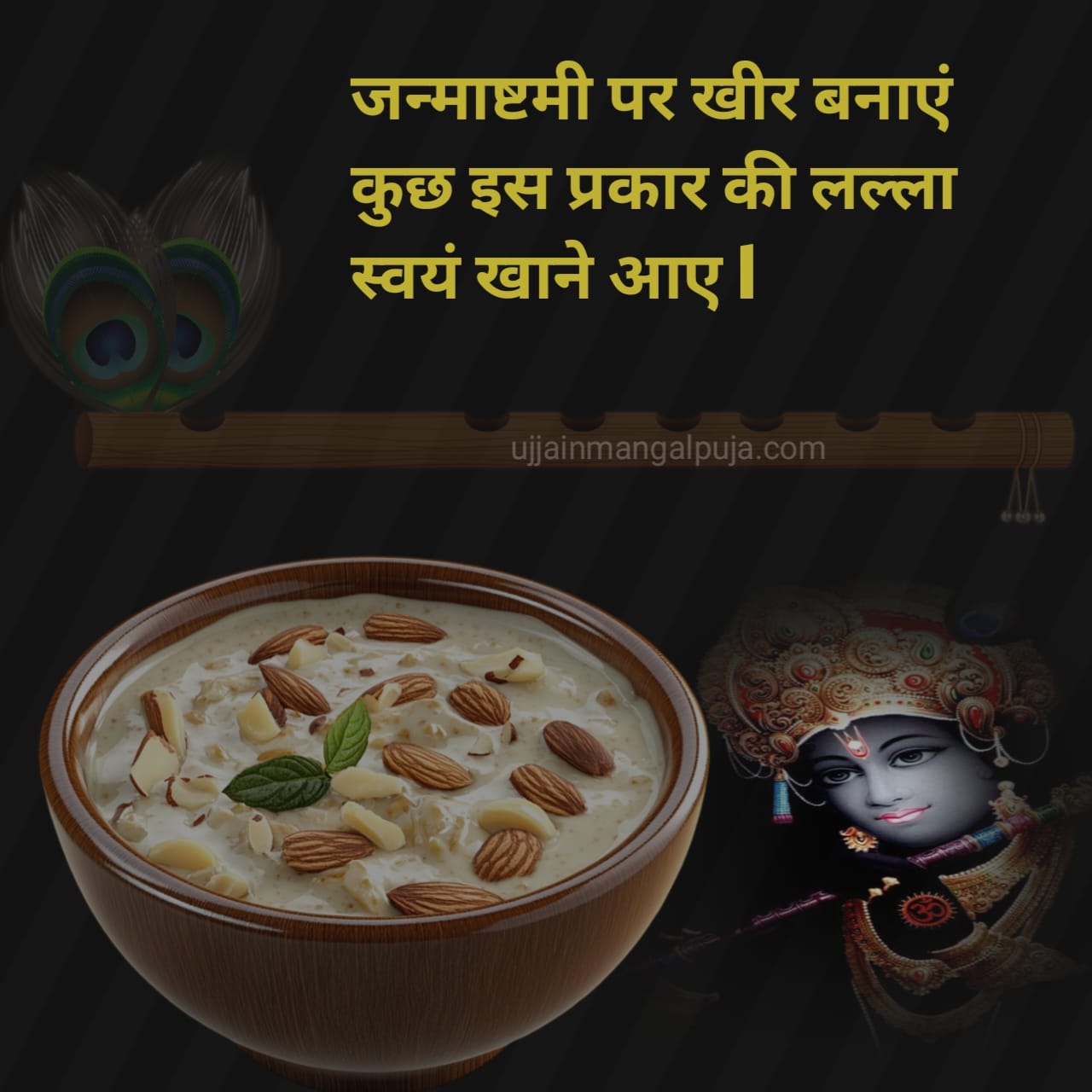 प्यारे कृष्ण भक्तों, ujjainmangalpuja.com की और से आप सभी को जन्माष्टमी की अग्रिम शुभकामनाएं। इस दिन लल्ला के स्वागत हेतु विभिन्न पकवान बनाए जाते हैं, जिनमें लल्ला हेतु बनाई खीर का विशेष महत्व होता है। परन्तु क्या आप जानते खीर बनाते समय कुछ विशेष नियमों का ध्यान रखा जाए तो खीर स्वादिष्ट ही नहीं, अपितु लल्ला स्वयं उसे गृहण करते है। प्रसिद्ध कथा वक्त्ता श्री इंद्रेशजी महाराज कहते है कि जो व्यक्ति इस विधि अनुसार खीर बनता है उनका भोग लल्ला स्वयं गृहण करते है, तो आए और जाने इस अनोखी विधि के बारे में :–